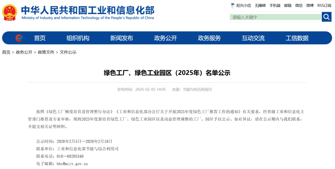 2月5日,工业和信息化部发布绿色工厂、绿色工业园区(2025年)公示名单。