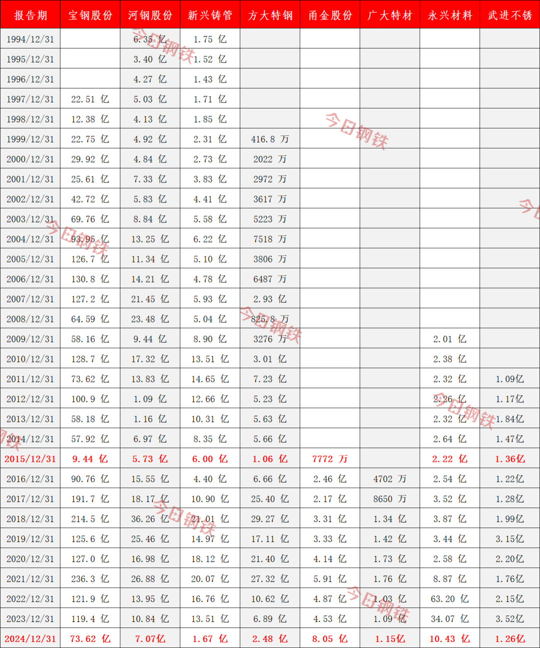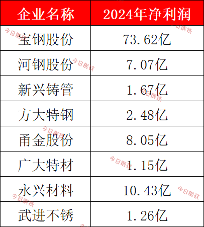上市以来,8家企业利润表 披露数据显示,宝钢股份、河钢股份、新兴铸管、方大特钢、甬金股份、广大特材、永兴材料、武进不锈8家钢企,面对行业的波谲云诡,保持持续盈利的良好业绩。 钢铁行业常青树 2015年和2024年,是中国钢铁行业两个极具标志性的“至暗时刻”。 2015年,钢铁行业遭遇史上严峻的挑战。中钢协会员企业亏损面达50.5%,亏损额高达645.34亿元。但就是在这样的2015年,7家(广大特材尚未上市)均保持盈利。 在这份名单中,永兴材料、武进不锈展现出较好的韧性,下滑幅度不是很大。 2024年,行业在深度调整期中挣扎。房地产下行拖累建筑用钢需求,铁矿石高价持续侵蚀利润,不少企业利润腰斩,甚至陷入亏损泥潭。 在此背景下,8家企业依然全部保持盈利。其中,甬金股份成为最大黑马,业绩逆势上扬,实现大幅增长。 2015年、2024年,两个钢铁行业的至暗年份,多家企业的利润规模实现了质的飞跃: • 宝钢股份从2015年的9.44亿跃升至2024年的73.62亿,增长约679%; • 河钢股份从2015年的5.73亿上升至2024年的7.07亿,增长约23%; • 方大特钢从2015年的1.06亿上升至2024年的2.48亿,增长约134%; • 甬金股份从2015年的7772万跃升至2024年的8.05亿,增长约936%; • 永兴材料从2015年的2.22亿跃升至2024年的10.43亿,增长约370%。 从数据来看,宝钢股份、河钢股份、方大特钢、甬金股份、永兴材料尽管利润随周期波动,但盈利的底部在逐轮周期中抬升。 同时值得注意的是,新兴铸管虽然仍保持盈利,但2024年利润断崖式跌至1.67亿,几乎回到30年前水平,表明传统优势领域趋于饱和,而新增长点未能及时补位时,即便曾经的王者也可能瞬间跌落。 风浪中的盈利之道 回望这8家企业的发展历程,我们发现:同样是持续盈利,背后的逻辑却不尽相同。 高端市场深耕,构筑护城河 宝钢股份 宝钢汽车板伴随中国汽车工业成长,经过多年发展,目前国内市场占有率稳定在50%-55%,在全球汽车板供应商中处于第一梯队。硅钢作为其第二大战略产品,产能超400万吨,是全球最大供应商。2024年6月,宝山基地取向硅钢产品结构优化(二步)项目投产后,年产能提升至116万吨,成为全球第一。 武进不锈 武进不锈成立于2001年3月30日,于2016年12月19日在上海证券交易所上市。作为国家高新技术企业和国家制造业单项冠军企业,武进不锈的产品广泛应用于电站锅炉、核电、石油、石化、化工、光伏发电、光热发电、船舶与海洋工程、压力容器、机械制造等高端领域。从盈利能力看,2025年上半年毛利率为14.41%(上一年同期16.60%),高于行业平均的8.51%,显示出公司有较好的盈利空间。 产业链延伸,重构价值链 河钢股份 河钢股份是中国第一大家电用钢、第二大汽车用钢制造商,产品服务于国内外高端市场。此外,河钢股份是世界第二大钒钛材料制造商,在钒钛冶炼和钒产品生产技术方面处于世界领先地位。近年来,河钢股份布局钒产品、钒电池材料,这些产业的发展不仅为公司带来新的盈利增长点,更为未来新能源领域发展奠定基础。 广大特材 广大特材的主营业务为高端装备特钢材料和高端装备零部件的研发、生产、销售,形成了“材料+零部件”的产品格局。截至2024年末,广大特材已成为国内大型风电铸件的第一梯队成员,并在齿轮箱零部件领域具备自主精加工能力,进一步提升了市场竞争力。 细分领域,开辟新路径 新兴铸管 新兴铸管作为球墨铸铁管行业的领军企业,综合技术实力和生产规模位居世界首位,蝉联冶金企业“竞争力极强A+”评级。作为中国球墨铸铁管行业的唯一代表,其铸管产品国内市场和出口市场具有显著优势,产品出口120多个国家和地区,覆盖亚洲、欧洲、非洲、美洲等全球市场。 方大特钢 方大特钢是中国最大的弹簧扁钢生产基地,产量占据国内的半壁江山。近年来,方大特钢高度重视科技创新,其产品研发成果丰硕,生产的弹簧扁钢和热轧带肋钢筋荣获国家产品“金杯奖”,形成了“长力”牌汽车弹扁和“海鸥”牌建筑钢材两大系列品牌优势。 多元化发展,平滑周期波动 甬金股份: 以精密冷轧不锈钢板带为核心产品,能够满足家电、电子、医疗器械等领域对不锈钢材料的严格要求。除钢铁业务外,甬金股份还涉及新能源电池外壳专用材料、层状复合材料等多个领域。这种多元化的产品布局可以满足不同客户的需求,降低单一产品市场波动对企业的影响,提高企业的抗风险能力。 永兴材料 永兴材料是全球高端装备及锂电新能源的基础母材提供商。自2000年成立以来,专注于不锈钢棒线材及特殊合金材料的研发、生产和销售,具有领先水平的特钢材料。为进一步提升核心竞争力和可持续发展能力,在特钢新材料业务稳健发展的基础上,于2017年拓展战略性新兴产业之一的锂电新能源业务作为第二主业。“特钢+锂电”的双轮驱动战略,有效平滑了单一行业的剧烈波动。 诸峰并立,各自成景。在发展的浪潮中,宝钢股份、方大特钢等8家钢企穿越行业至暗时刻,守住持续盈利底线,这不仅是战略定力的回报,更是中国钢铁工业从“规模扩张”向“价值创造”转型的微观缩影。 这份业绩表格,是历史的回响,更是未来的启示。在钢铁大国向钢铁强国转型的征程中,唯有摒弃粗放扩张,深耕核心优势,技术与战略创新,才能在行业浪潮中屹立不倒,成为真正穿越周期的行业常青树。 - END -