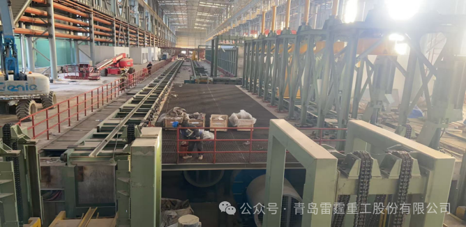在邢钢转型升级的宏伟蓝图中,搬迁改造项目承载着企业焕新重生、向高端智能制造迈进的历史使命。作为新生产基地的核心生产线之一,大盘卷项目自启动以来便全速推进。其中,由青岛雷霆重工负责制造安装的精整区设备是决定产品最终外观质量、包装品质及交付状态的“最后一环”,其设备安装的完成,意味着整条生产线已实现物理贯通,从加热炉到成品发运的完整链条已经成型。 高效冷却系统安装就位:长达百余米的立式输送滚床(包含吹风站、保温通廊)安装精准,将实现对轧后盘卷的均匀、可控冷却,是保证产品性能稳定的关键; 智能输送系统全线贯通:承载盘卷运行的P/F线已完成安装,进入调试阶段,实现了盘卷在精整区内各工位间的自动、有序流转; 标识与检测设备安装完成:自动喷印机、在线称重、自动卸卷等设备安装完毕,将为每一卷产品赋予精准的“身份信息”,确保质量全程可追溯。 整个区域布局合理,物流顺畅,充分体现了 “流程最优、自动化程度最高、操作最便捷” 的先进设计理念;精整区集成了多项行业先进技术,是项目“高端化、智能化、绿色化”定位的集中体现。 精整区设备的安装完成,吹响了项目向 “全线机械竣工” 和 “热负荷试车” 冲刺的号角,下一步,工作重心将全面转入设备的单机调试、联动试车和工艺优化阶段。 让我们共同期待,这条凝聚着无数人心血与希望的现代化生产线,早日奔腾出绚丽的钢花,奏响邢钢新时代的恢宏乐章!