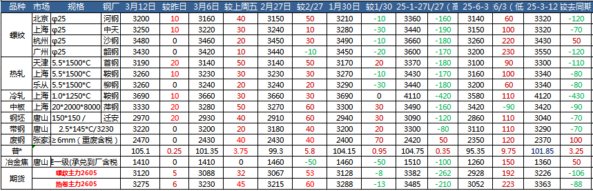 需求方面,在成本支撑与结构性需求的双重作用下,钢材品种涨幅差异化:能源基建相关板材、特钢涨幅领先,传统建材受内需复苏节奏制约表现相对平缓,结构性行情特征愈发突出。随着全国复工复产全面推进,基建、制造、能源项目集中启动,下游开工率稳步回升,钢材表观消费快速回暖,供需格局向紧平衡转变。高库存情况下,钢价窄幅震荡偏强运行,总体价格波幅相对有限。