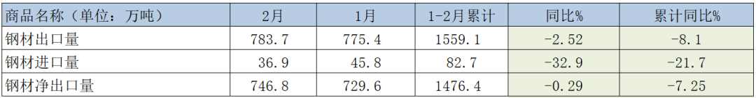 出口方面:最新海关总署发布数据来看,2026 年 1-2 月,我国钢材累计出口 1559.1 万吨,同比下降 8.1%,受出口许可证政策及贸易环境影响,直接钢材出口短期承压。但间接下游出口呈现爆发式增长,有效对冲了直接出口的减量,支撑钢材整体需求韧性,得益于需求结构的优化升级,传统建材需求弱化的同时,高端制造与基建配套需求持续补强。