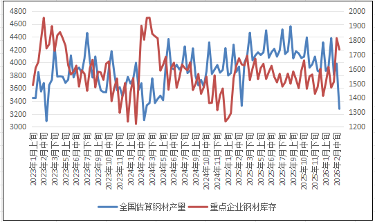 2026年2月下旬,重点统计钢铁企业钢材库存量1734万吨,环比上一旬减少78万吨,下降4.3%;比年初增加320万吨,增长22.6%;比上月同旬增加263万吨,增长17.9%;比去年同旬增加103万吨,增长6.3%,比前年同旬减少68万吨,下降3.8%。