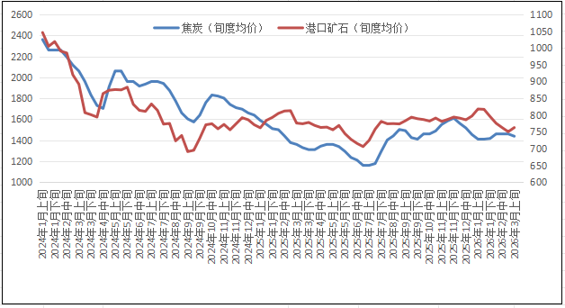 单位:元/吨 焦炭 铁矿石港口现货价格走势图(旬)