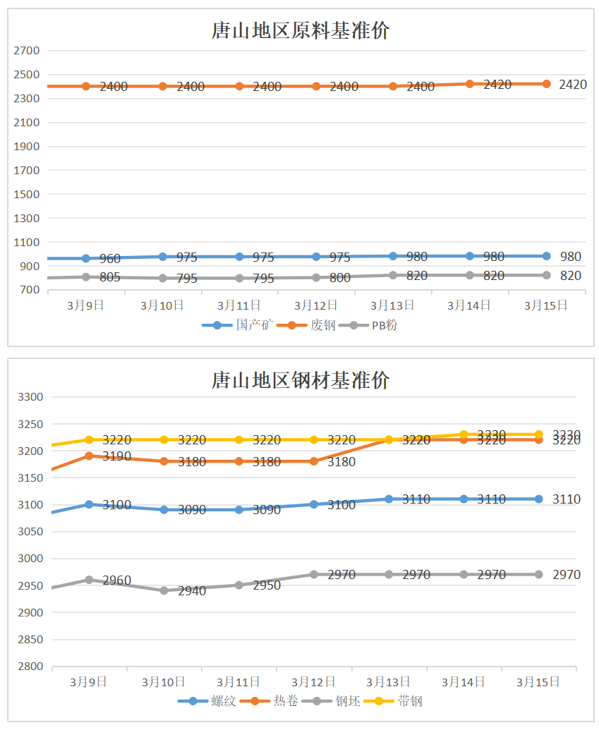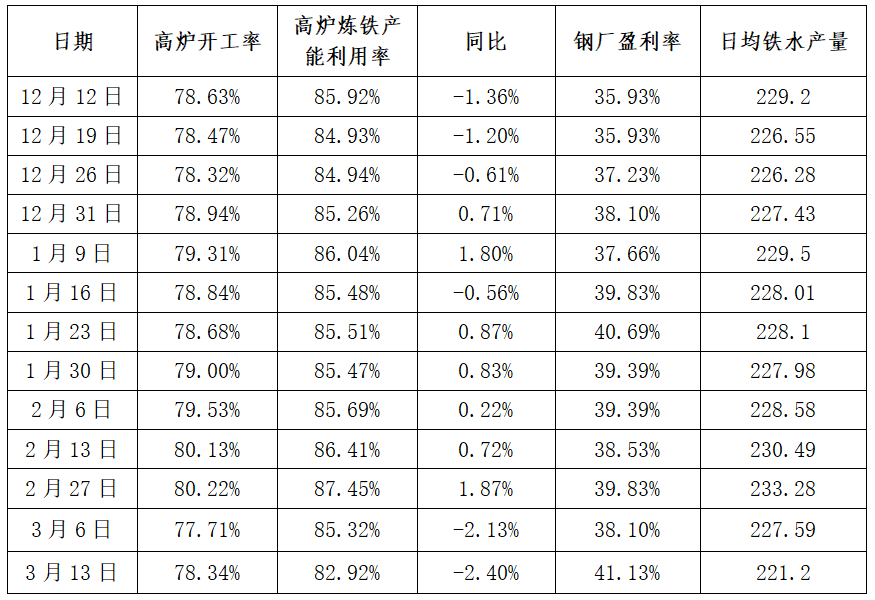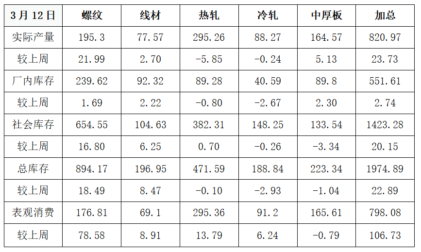 ▲ 伊朗专家会议发表声明,宣布推举已故最高领袖阿里·哈梅内伊之子穆杰塔巴·哈梅内伊为伊朗伊斯兰共和国新任最高领袖。当地时间3月12日,其发表就任最高领袖以来首份声明称,伊朗不会放弃复仇,将继续采取包括封锁霍尔木兹海峡在内的战略手段。 ▲ 伊朗伊斯兰革命卫队当地时间3月14日发表声明称,霍尔木兹海峡目前也处于革命卫队海军的全面监控之下,美国、以色列及其盟友的油轮与商船仍被禁止通行,一旦发现其航行或穿越,将成为打击目标。 ▲ 美国总统特朗普3月13日傍晚在社交媒体发文称,美军已对伊朗石油出口枢纽哈尔克岛的军事目标发动“猛烈空袭”。哈尔克岛位于波斯湾西北部,是伊朗最大原油出口基地,负责处理伊朗全国90%的石油出口。 ▲ 美国总统特朗普当地时间3月14日在社交平台发文称,许多国家尤其是受到伊朗试图关闭霍尔木兹海峡影响的国家,将与美国一道派遣军舰,以确保该海峡保持开放和安全。 ▲ 美国劳工局最新数据显示,截至2026年3月7日当周,美国初请失业金人数为21.3万人,预期21.5万人,前值由21.3万人修正为21.4万人。 ▲ 美国贸易代表格里尔当地时间3月11日表示,美国将对包括中国、欧盟、墨西哥、越南、印度和日本在内的16个贸易伙伴发起301调查。 ▲ 受霍尔木兹海峡运输受阻影响,沙特、伊拉克、阿联酋和科威特合计减产约670万桶/日,全球石油供应整体减少约6%。 ▲ 国际能源署于2026年3月11日宣布,其32个成员国一致同意释放4亿桶战略石油储备,以应对中东冲突导致的全球石油供应紧张局面。 ▲ 美国最新通胀数据出炉,2月季调后CPI环比上涨0.3%,同比上涨2.4%,核心CPI环比上涨0.2%,同比上涨2.5%,均符合市场预期。 ▲ 英国国家统计局最新数据显示,2026年1月英国国内生产总值(GDP)环比录得0%增长,显著低于经济学家在路透调查中预测的0.2%增幅,亦低于去年12月0.1%的修正值。这一数据为今年经济开局蒙上阴影,叠加外部能源冲击,经济面临的不确定性持续加剧。 2 ● 国内资讯 ▲ 十四届全国人大四次会议在圆满完成各项议程后,3月12日下午在北京人民大会堂闭幕。大会批准政府工作报告、“十五五”规划纲要、2026年国民经济和社会发展计划、2026年中央预算等,通过生态环境法典、民族团结进步促进法、国家发展规划法。 ▲ 3月13日,“十五五”规划纲要全文发布。中华人民共和国国民经济和社会发展第十五个五年(2026-2030年)规划纲要,根据《中共中央关于制定国民经济和社会发展第十五个五年规划的建议》编制,主要阐明国家战略意图,明确政府工作重点,引导规范社会主体行为,是“十五五”时期我国全面建设社会主义现代化国家的宏伟蓝图,是全国各族人民共同的行动纲领。 ▲ 3月13日,《政府工作报告》全文发布。报告共分四个部分:一、2025年工作回顾;二、“十五五”时期主要目标和重大任务;三、2026年经济社会发展总体要求和政策取向;四、2026年政府工作任务。报告指出,今年发展主要预期目标是:经济增长4.5%-5%,在实际工作中努力争取更好结果;城镇调查失业率5.5%左右,城镇新增就业1200万人以上;居民消费价格涨幅2%左右;粮食产量1.4万亿斤左右;单位国内生产总值二氧化碳排放降低3.8%左右。 ▲ 3月14日,新华社受权发布《关于2025年中央和地方预算执行情况与2026年中央和地方预算草案的报告》。《报告》指出,着力扩大有效投资;安排8000亿元超长期特别国债资金用于“两重”建设;完善专项债券投向领域“负面清单”,适当调整专项债券项目“自审自发”试点范围;中央预算内投资安排7550亿元、增加200亿元。 ▲ 2026年开年中国外贸实现“开门红”。海关总署数据显示,前2个月,我国货物贸易进出口总值7.73万亿元人民币,同比增长18.3%。其中,出口4.62万亿元,增长19.2%;进口3.11万亿元,增长17.1%。 ▲ 国家统计局数据显示,2月份,全国居民消费价格指数(CPI)环比涨幅由上月的0.2%扩大至1.0%,为近两年来最高;同比涨幅由上月的0.2%扩大至1.3%,为近三年来最高。2月份,全国工业生产者出厂价格指数(PPI)环比上涨0.4%,涨幅与上月相同,已连续5个月上涨。其中,国际有色金属、原油价格上行拉动国内相关行业价格上涨。 ▲大初步统计,2026年前两个月社会融资规模增量累计为9.6万亿元,比上年同期多3162亿元。前两个月人民币贷款增加5.61万亿元。2月末,M2同比增长9%,M1同比增长5.9%。 3 ● 钢市动态 钢企生产情况 ▲ 高炉开工率:78.34%,环比上周增加0.63%,同比去年减少2.24% 。 ▲ 独立电弧炉钢厂开工率:57.34%,环比上升32.63%,同比下降12.59%。 ▲ 日均铁水产量:221.2万吨,环比上周减少6.39万吨,同比去年减少9.39万吨。 ▲ 高炉炼铁产能利用率:82.92%,环比上周减少2.40%,同比去年减少3.65%。 钢企盈利情况 ▲ 钢企成本情况:上周,唐山主流样本钢厂平均成本2906元/吨,较上周有所上升。 ▲ 钢企盈利情况:与3月15日唐山迁安普方坯出厂价格2970元/吨相比,钢厂平均盈利64元/吨。 ▲ 钢企盈利率:41.13%,环比上周增加3.03%,同比去年减少12.12%。 ▲ 独立电弧炉盈利情况:全国94家独立电弧炉钢厂产品盈利情况如下:33.06%的钢厂微利,59.68%的钢厂持平(这其中部分因停产导致产品盈利情况持平),7.26%的钢厂亏损。 钢材市场供需 ▲ 供应量:五大钢材品种供应820.97万吨,周环比增加23.73万吨,增幅3%。 ▲ 库存量:五大钢材总库存1974.89万吨,周环比增22.89万吨,增幅1.2%。 ▲ 消费