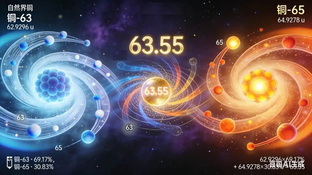 如果我告诉你,有一种“#铜 ”,一克几百万,比黄金贵几千倍,你信吗?它就是#铜同位素:铜-63和铜-65 。今天,我们来认识铜的这一对“ 孪生兄弟 ” ,以及它们二十多个短命的“表兄弟” 。一位癌症患者躺在 PET-CT 扫描床上,医生注射了一种透明的液体。几个小时后,屏幕上清晰地显示出肿瘤的位置 —— 发光的病灶像黑夜中的篝火,无处遁形。几天后,患者再次注射另一种药水。这次,药物精准地聚集在肿瘤内部,从内部定向爆破癌细胞,而对周围正常组织几乎无伤。更妙的是,这两种药物用的是同一种靶向分子 —— 先用铜-64做PET扫描,确认药物找到了肿瘤;再换铜-67进行治疗。这就是现代医学前沿的“ 诊疗一体化”:所见即所治。而铜-64和铜-67,都是从我们最熟悉的金属铜 —— 通过核反应人工制造出来的。#铜:第 29号元素,它的相对原子质量63.55 ,也是个加权平均数。因为自然界中的铜,其实是两个“ 孪生兄弟”的混合物:丰度: 69.17% ,质量: 62.9296 u丰度: 30.83% ,质量: 64.9278 u`(62.9296 × 69.17%) + (64.9278 × 30.83%) = 63.55 u`这意味着,你手里拿的任何一块铜,里面都有大约70%的铜-63原子和30%的铜-65原子。这一对双胞胎,从地球诞生那天起就形影不离。问题来了:既然它们长得几乎一模一样,天然混合,如何分开呢?答案是:靠质量。铜-63比铜-65轻了大约3%—— 这个微小差异,在科学家眼里,就是突破口。