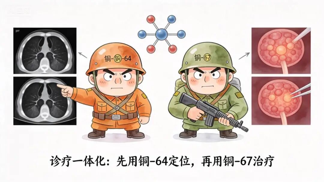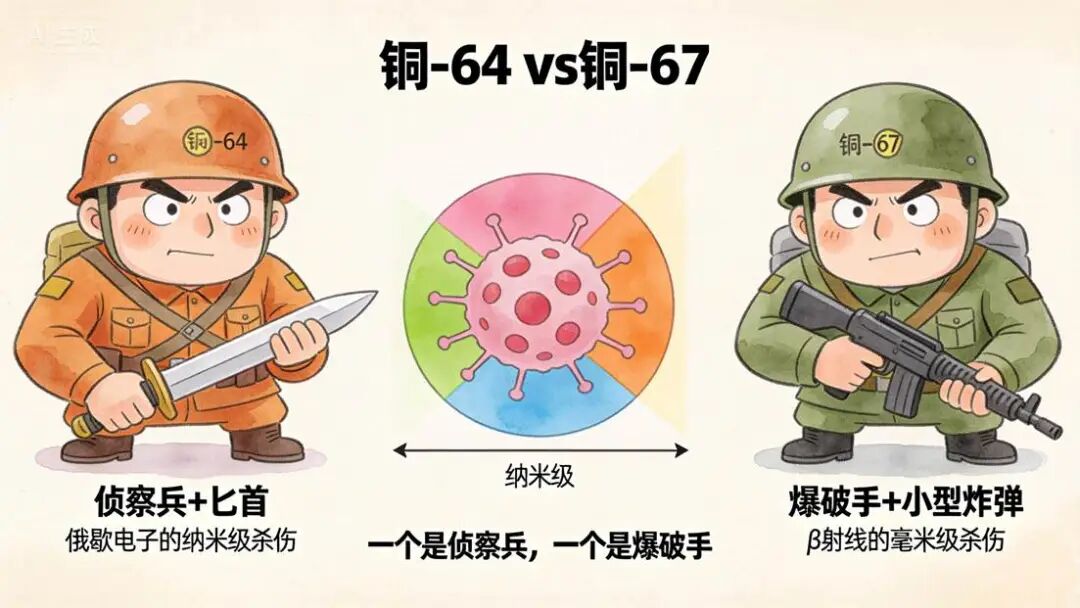 铜-67 发射的 β 射线能量适中,射程短(在水中仅约3毫米)。把它标记在能识别癌细胞的药物上,注射入体内后,它会精准聚集在肿瘤部位,从内部 “ 定向爆破 ” 癌细胞,而对周围正常组织损伤极小。铜-64和铜-67可以用同一种药物分子标记。先用铜-64做PET扫描,确认药物找到了肿瘤;再换铜-67进行治疗—— 这就是“ 诊疗一体化”的精髓:所见即所治。铜 -64 和铜 -67 的半衰期只有十几个小时到几天。这意味着它们无法长期保存,必须现产现用。