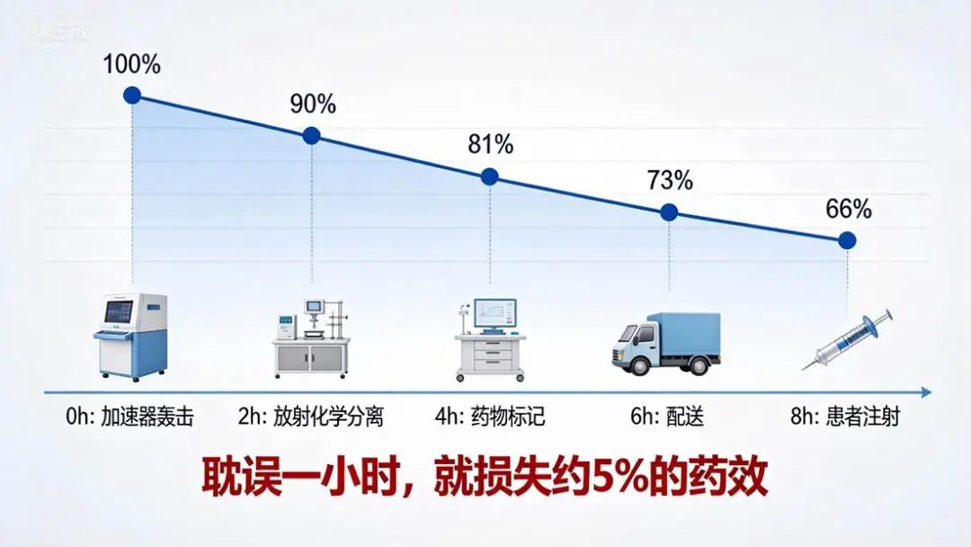 - 第 0 小时 :在加速器中用质子束轰击靶材,开始生产