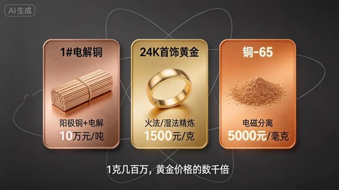 高纯度的铜-65 ,一毫克价值数百美元。按今天的金价,它是24K首饰金价格的数千倍。为什么这么贵?要得到 1 克高纯度的铜-65,理论上原料只需3克天然铜,但需要经过长期、大型多级电磁分离、超高真空、大型冷却系统、辐射屏蔽与防护、丰度测定 …… 这不是“ 冶炼”,而是“元素级的精挑细选”。