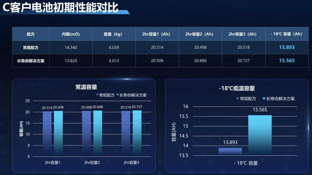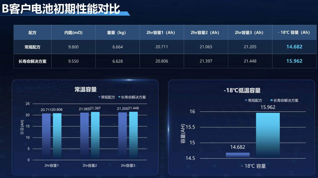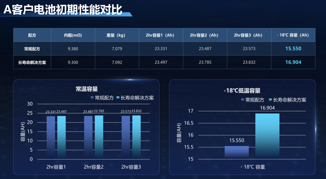 除了循环寿命的翻倍提升,该复合添加剂还让铅酸电池在容量、低温性能、内阻等核心指标上实现全面优化。在多家客户的实测中,添加该添加剂的电池常温2hr容量较常规配方平均提升1Ah左右,-18℃低温容量提升显著,A、B、C三家客户的低温容量分别从15.550Ah、14.682Ah、13.893Ah提升至16.904Ah、15.962Ah、15.565Ah。除此之外,电池内阻小幅下降,重量略有减轻,在保持铅酸电池成本优势的同时,补齐了性能短板。更值得关注的是,该电池在循环过程中放电平台稳定,可实现多次循环后容量无明显衰减,改善了传统铅酸电池后期续航快速缩水的问题。