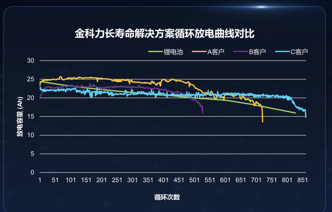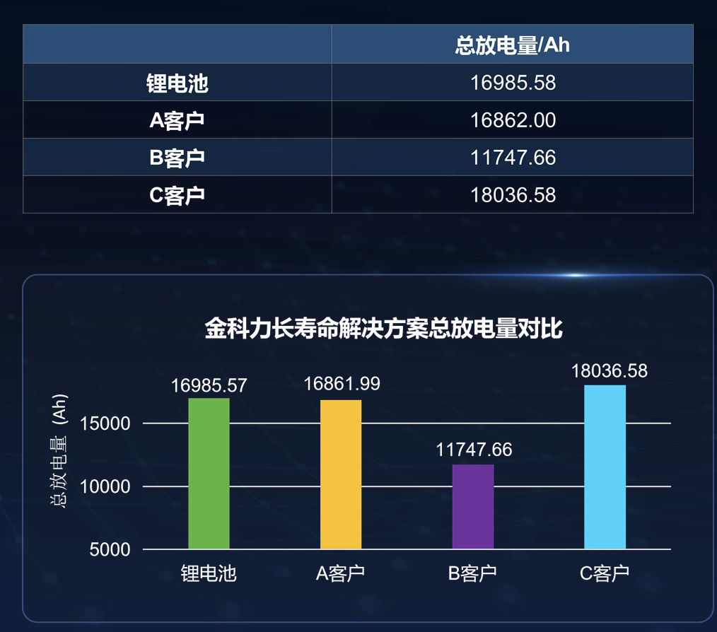 此次金科力推出的铅酸蓄电池用复合添加剂,在应用于铅酸电池生产环节后,实现了电池性能的全方位跃升:经实测,添加该产品的铅酸电池循环寿命突破860次,部分客户实测累计放电量甚至超过锂电池,达到18036.58Ah,相较于传统300-400次的循环寿命实现翻倍增长。2026年,金科力的目标是将添加该产品的铅酸电池循环寿命突破1000次。