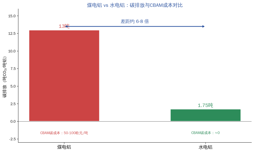 同样一吨铝,用煤电冶炼排放12-14吨二氧化碳,用水电冶炼只排1.5-2吨。六到八倍的碳排放差距,过去只是一个环保数字,现在变成了真金白银的成本差。