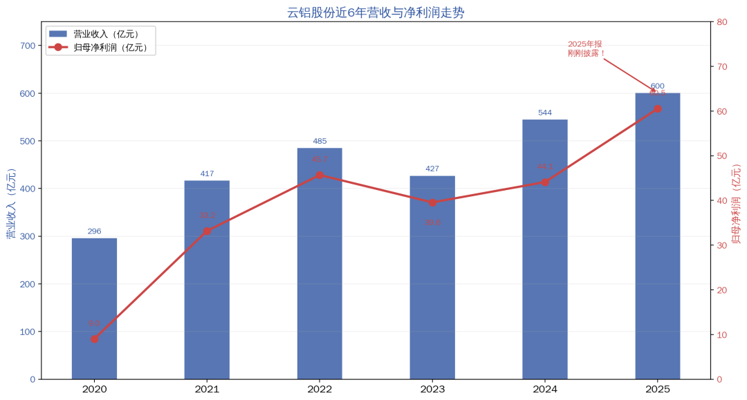 2020年,云铝营收295亿元,归母净利润仅9亿。到2025年——就在刚刚披露的年报里——营收突破600亿元,归母净利润60.55亿元,同比大增37.24%,双双创下历史新高。