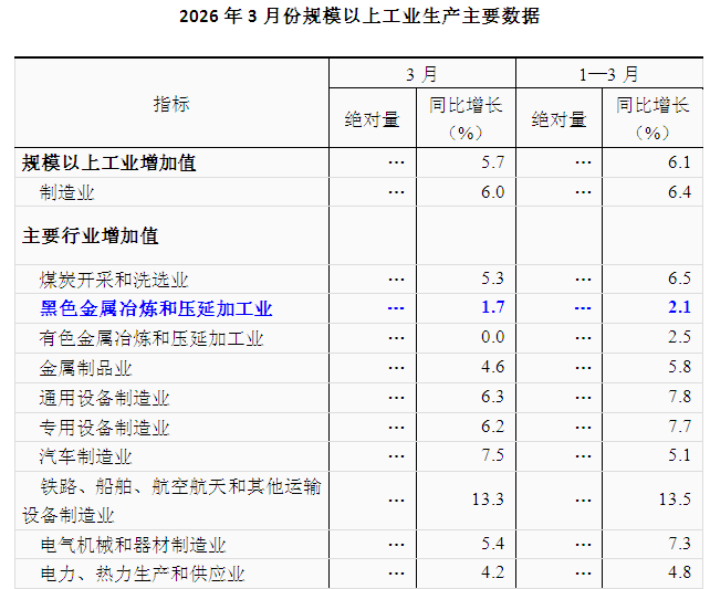 3月份黑色金属冶炼和压延加工业增加值为同比增长1.7%,1-3月份同比增长2.1%。