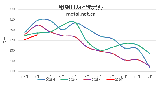 据国家统计局最新数据,2026年3月全国粗钢产量8704万吨,同比下降6.3%,生铁产量7328万吨,同比下降3.3%,钢材产量13098万吨,同比下降2.3%。