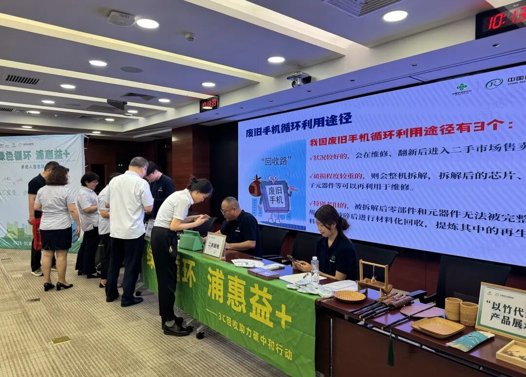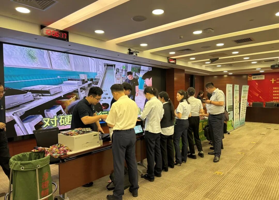 7月22日,由浦发银行北京分行主办,中国再生资源集团承办的,“绿色循环 浦惠益+”——3C回收助力碳中和行动圆满收官。活动旨在贯彻落实国家“两新”行动,依托专业回收流程与先进技术,实现3C电子产品的安全高效回收,同时保障职工的数据信息安全,提升资源循环利用率,助力浦发银行北京分行打造绿色金融标杆。